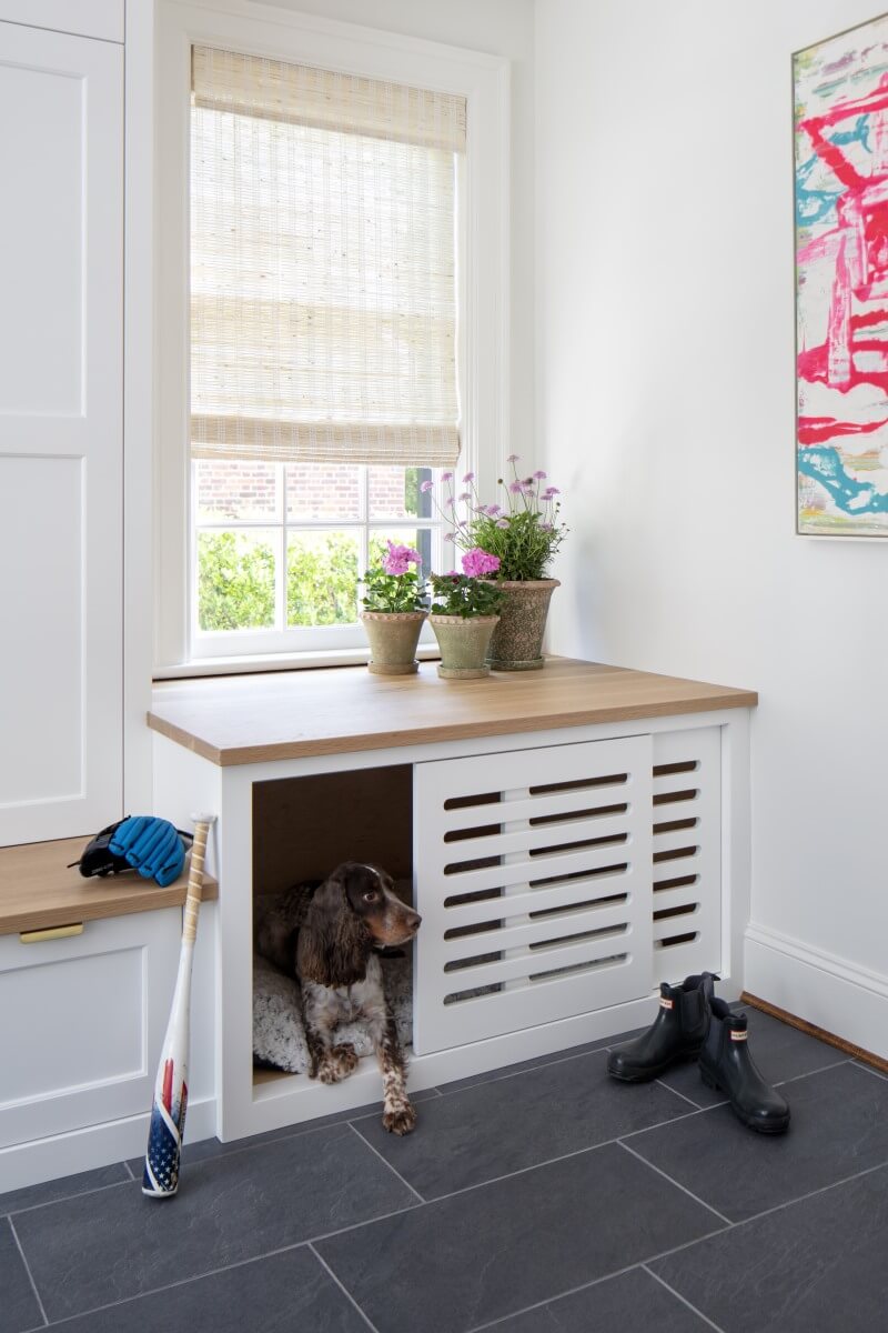This new mudroom gives a young family a great space for schooling and sports. Lockers give each member a dedicated space for backpacks, shoes, and jackets. The grain matched white oak desk is perfect for school work or mom. The dog Merle was also not forgotten with a custom dog crate. The bypass doors slide on concealed door hardware to make it easy to cleanup a messy pup's home.