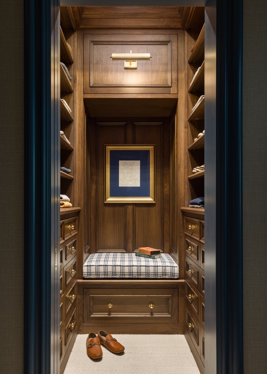 On this closet, our goal was to create a space that felt refined and tailored, while also being highly functional. We pulled in elements from the primary bathroom—using the same walnut paneling and inset cabinetry—to maintain a consistent look throughout the suite. To make the space practical, we incorporated a balanced mix of drawers and open shelving. We also built a custom upholstered bench into the center of the cabinetry, which adds both storage and seating—an efficient solution for a more compact footprint.