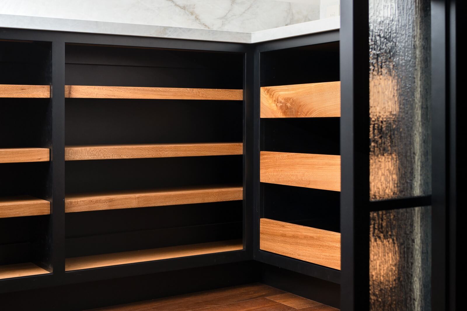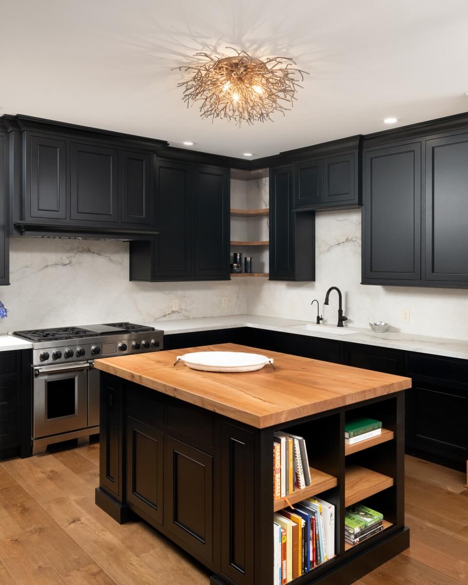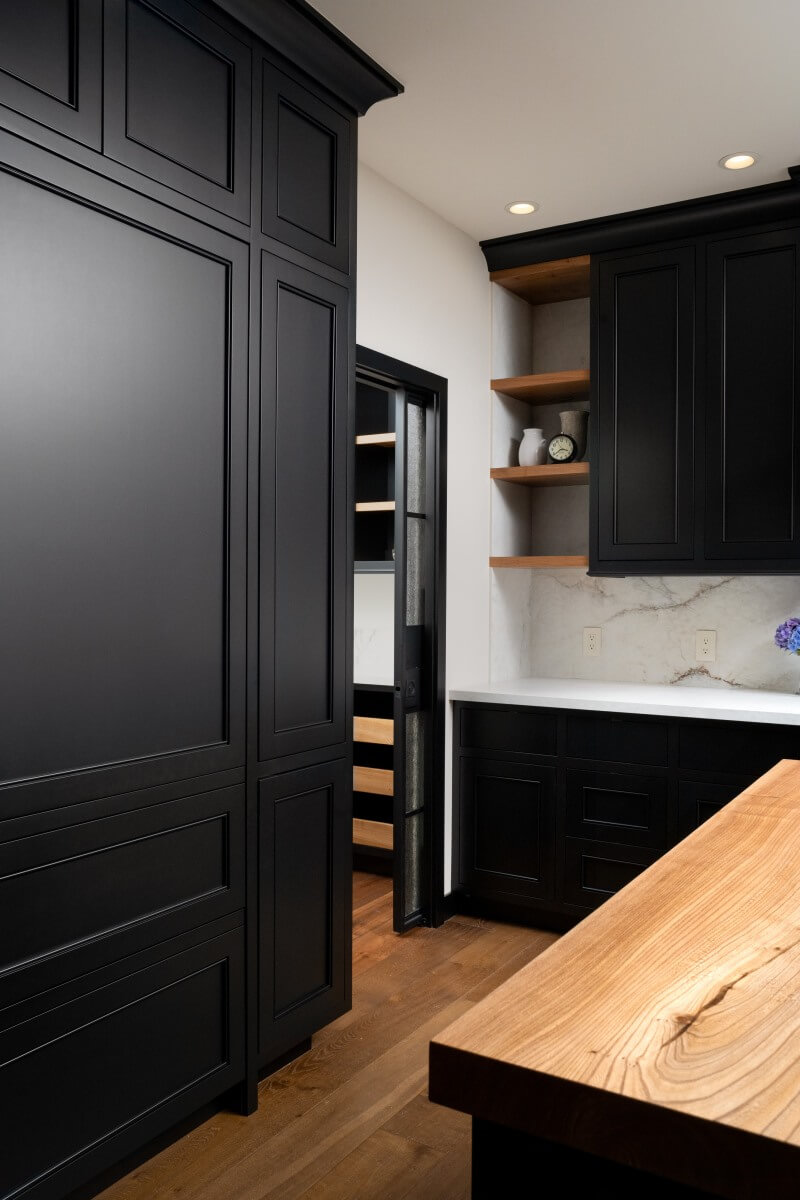 Black Painted, Inset Face frame with solid American Elm accent shelving, roll outs in pantry and counter top. Accent Moldings and custom hood vent.