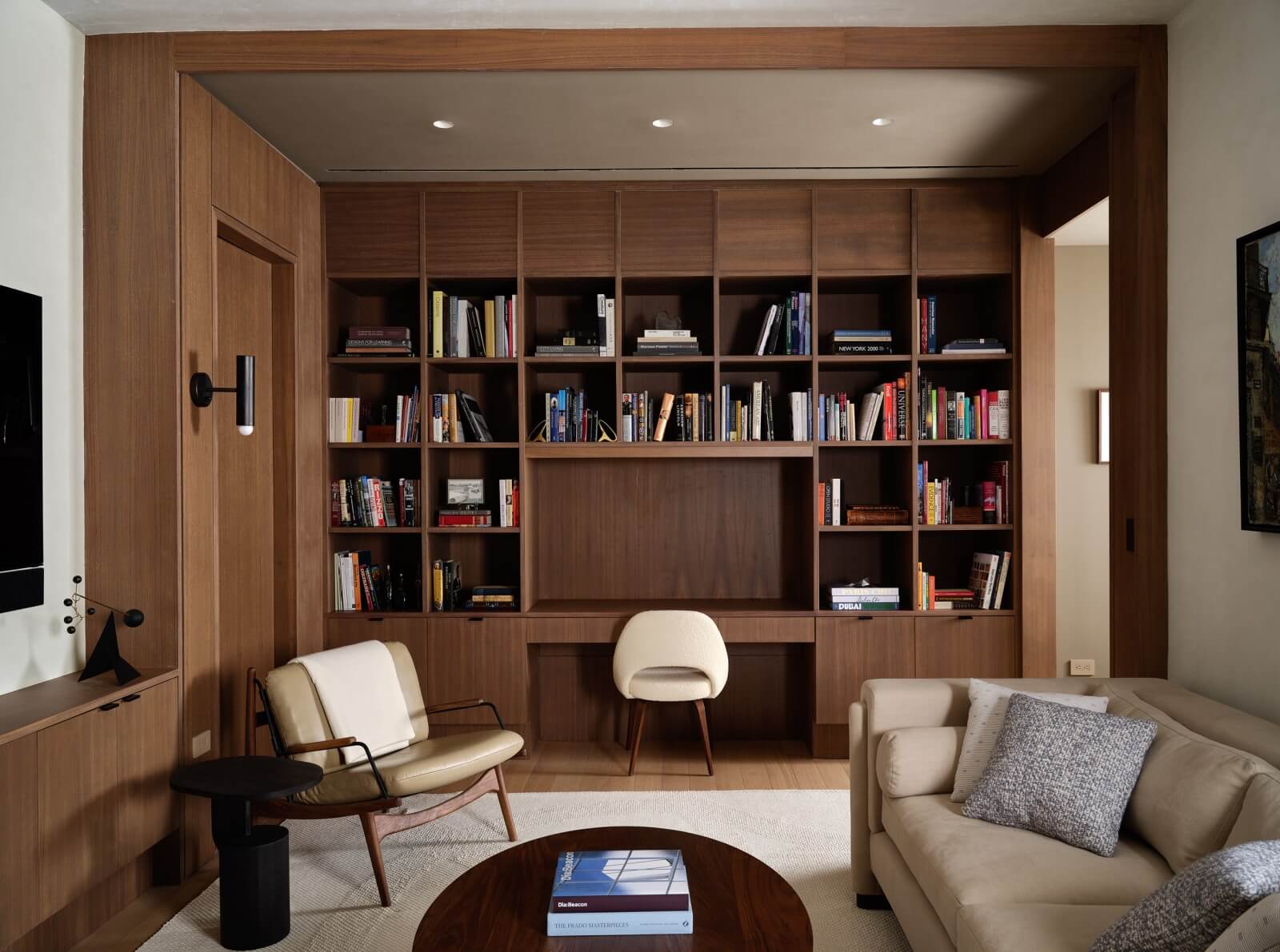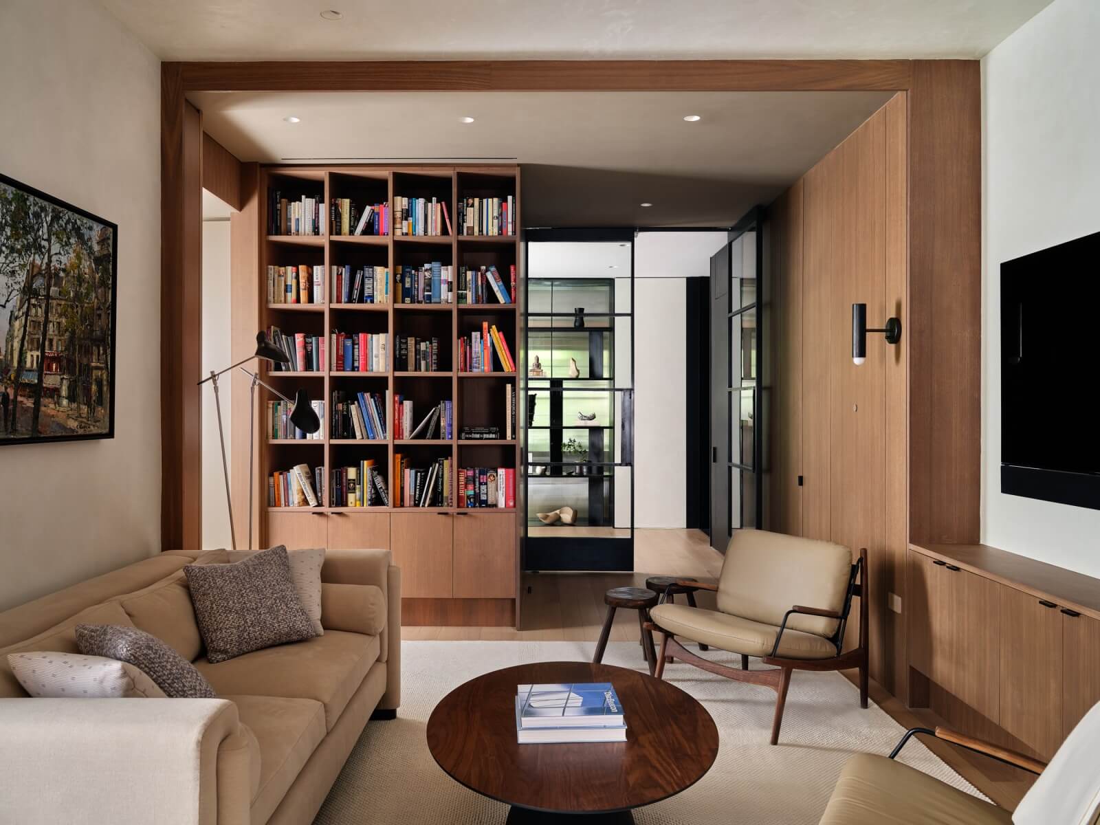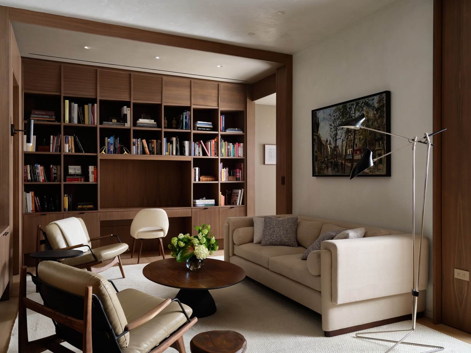 This luxury condo library features stained and cerused thickened frameless construction with full overlay cabinet doors in walnut. Due to this beautiful design execution, the more you look, the more storage you see behind hidden doors and integrated wall paneling.