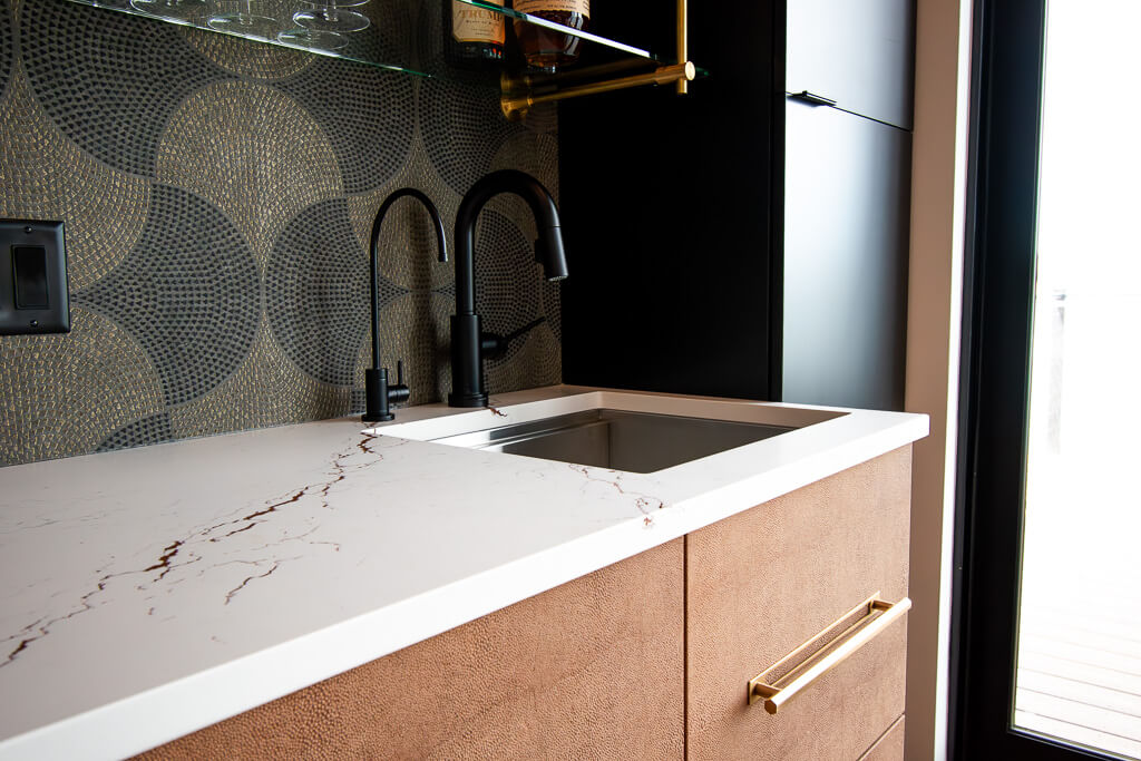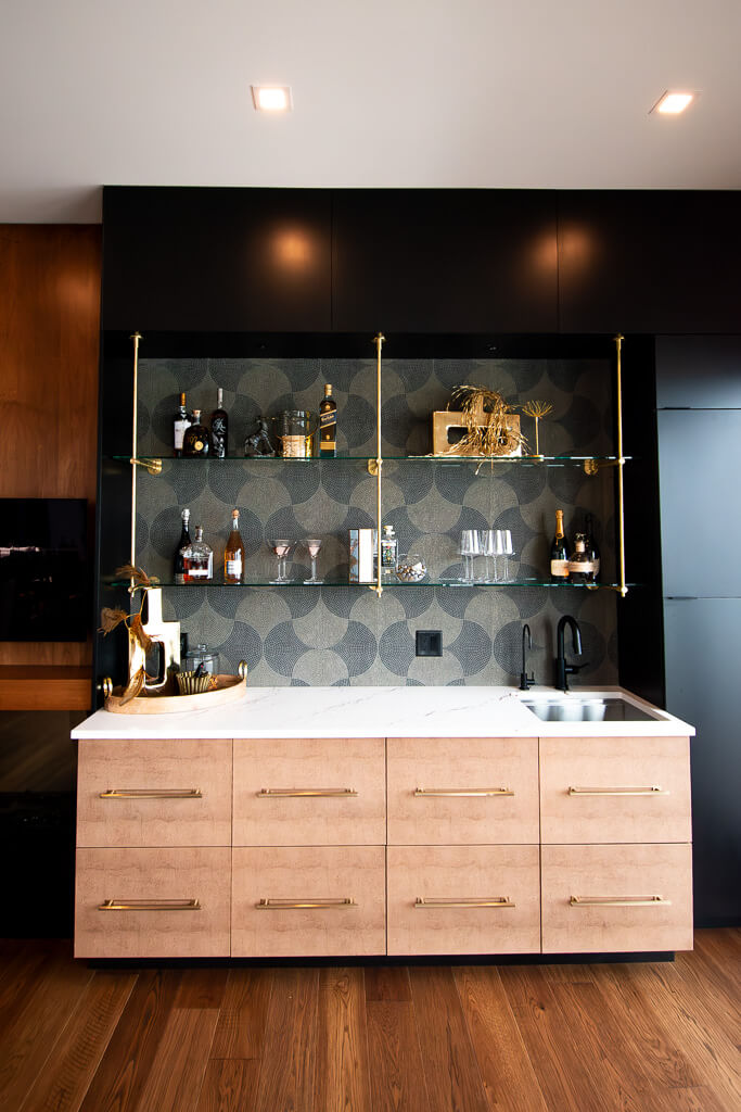 This bar was created as part of a recent new construction project we completed. Positioned adjacent to the main kitchen, the bar and fireplace were designed to offer a distinct gathering space while maintaining a seamless flow with the home's overall aesthetic. To make this area stand out, we incorporated EcoDomo leather-covered drawer fronts, Emtek gold hardware, and custom shelving from Iron Abode. The fireplace features a beautifully crafted veneer panel that was thoughtfully built out from the wall to conceal all wiring and electrical components for the television, ensuring both functionality and style.