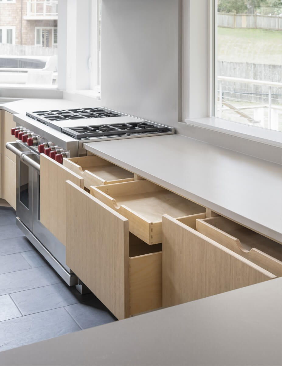 Custom stained with Sirca Natural Matte Finish, Grain matched. Blum Tip-on Door and Drawer Hardware throughout.