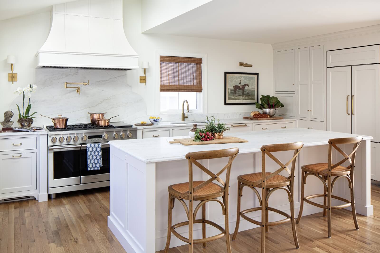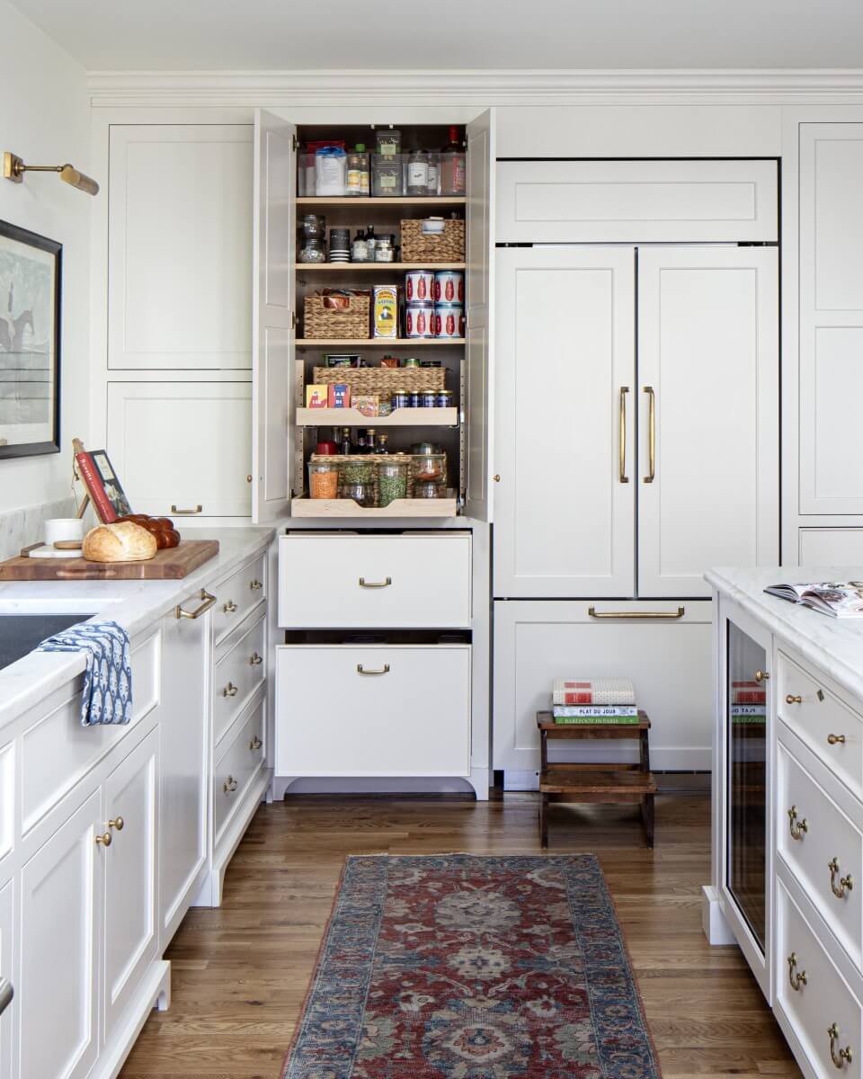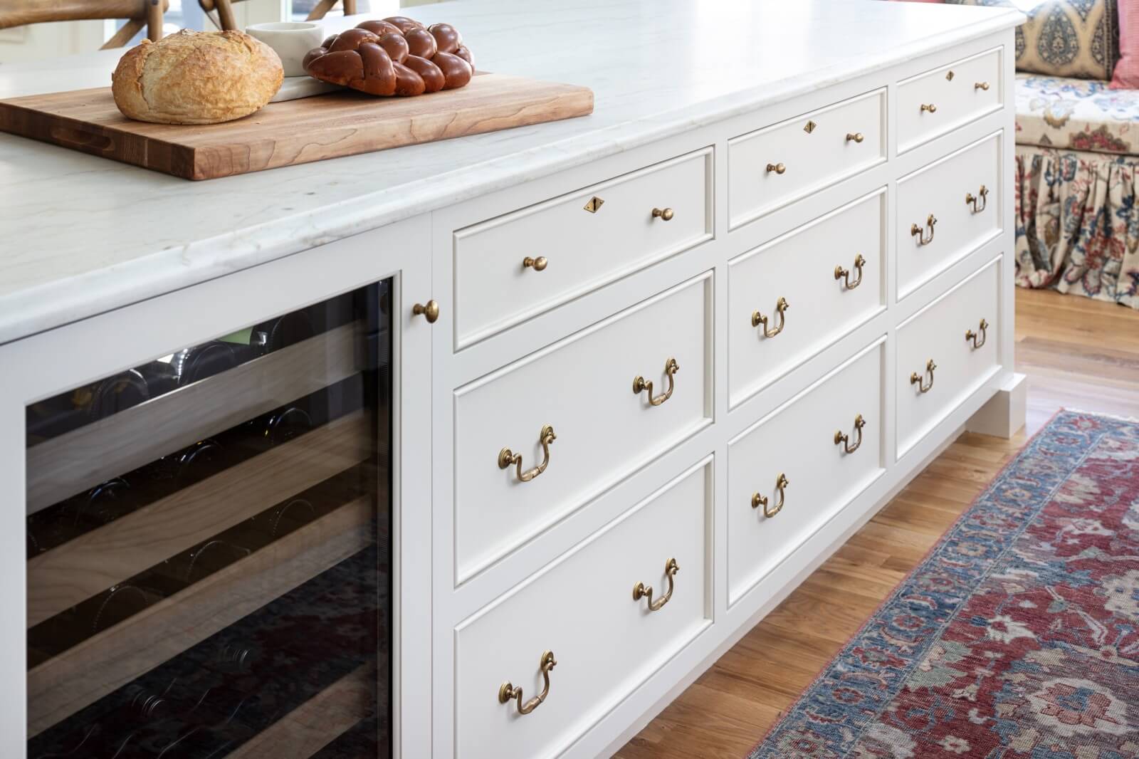 A traditionally inspired kitchen, our client had spent months designing every inch of her kitchen remodel. Eliminating upper wall cabinets provides a nice, clean backdrop for entertaining. Pop-up outlets and an in-drawer paper towel holder complete the clean look. The pantry wall features a lots of storage for frequently used baking and cooking ingredients. A concealed coffee bar flanks the other side of the Monogram fridge. The island was designed to feel like a piece of furniture with bale pulls and faux keyholes. Every piece of hardware in this kitchen was actually hand painted by our client.