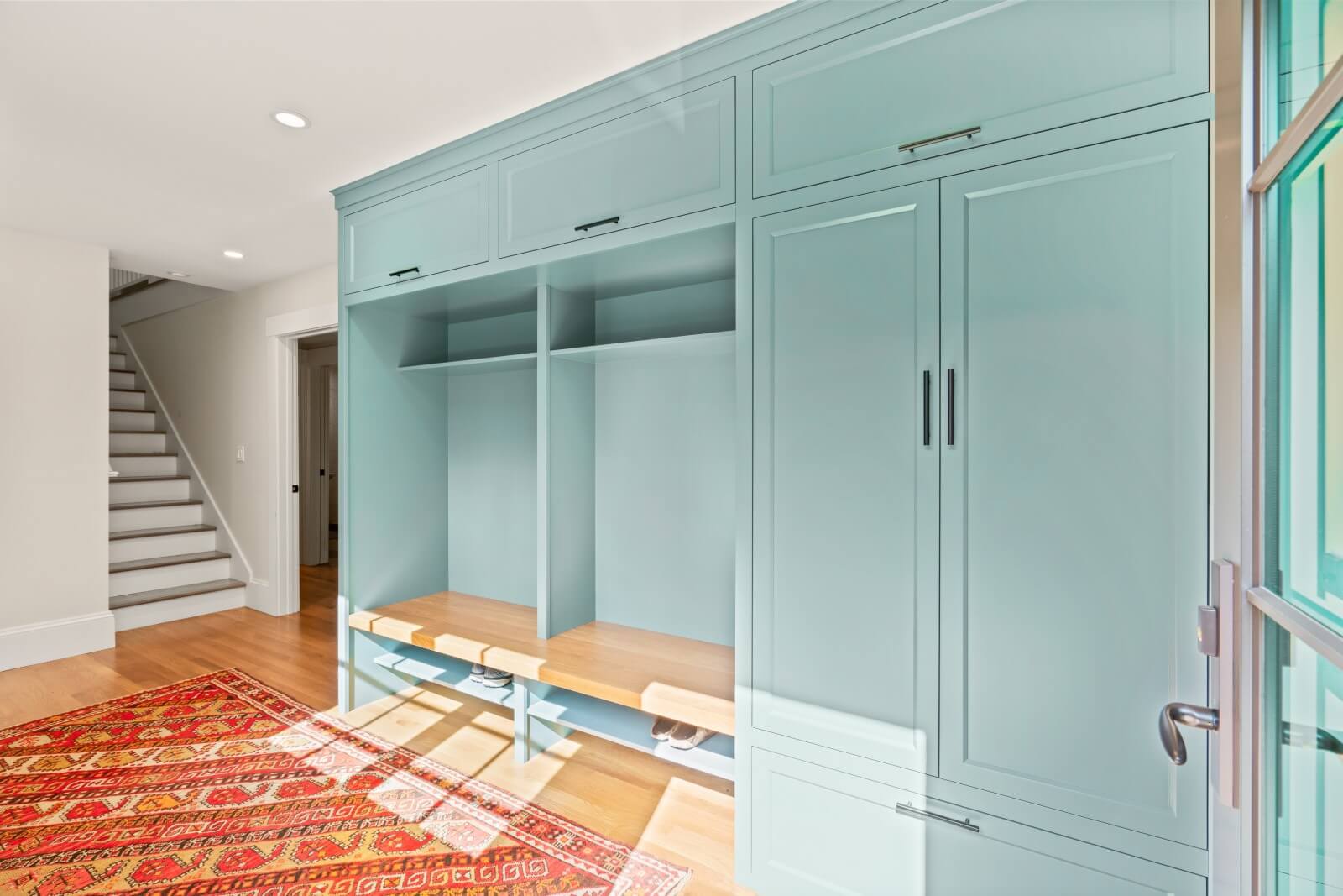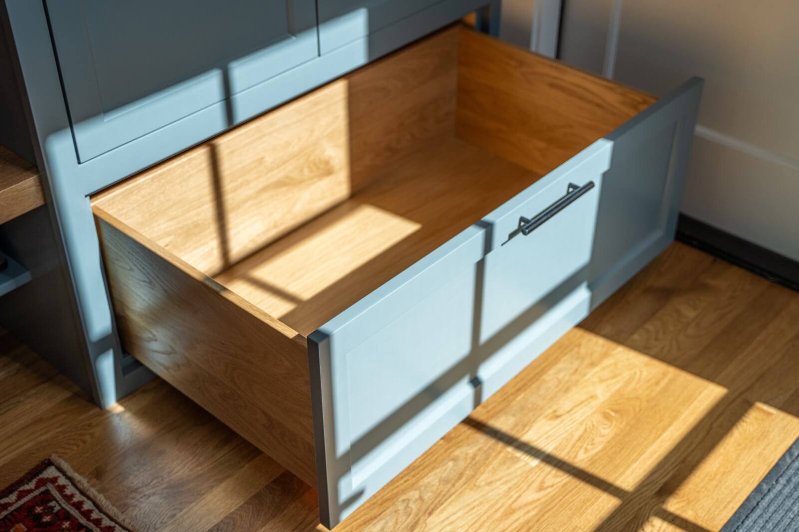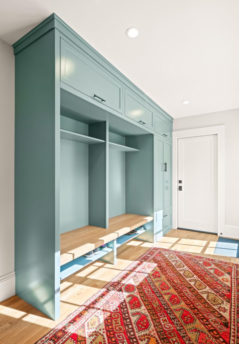 Mudroom Built In Painted with contrasting White Oak Bench Seat and custom made white oak drawer box.