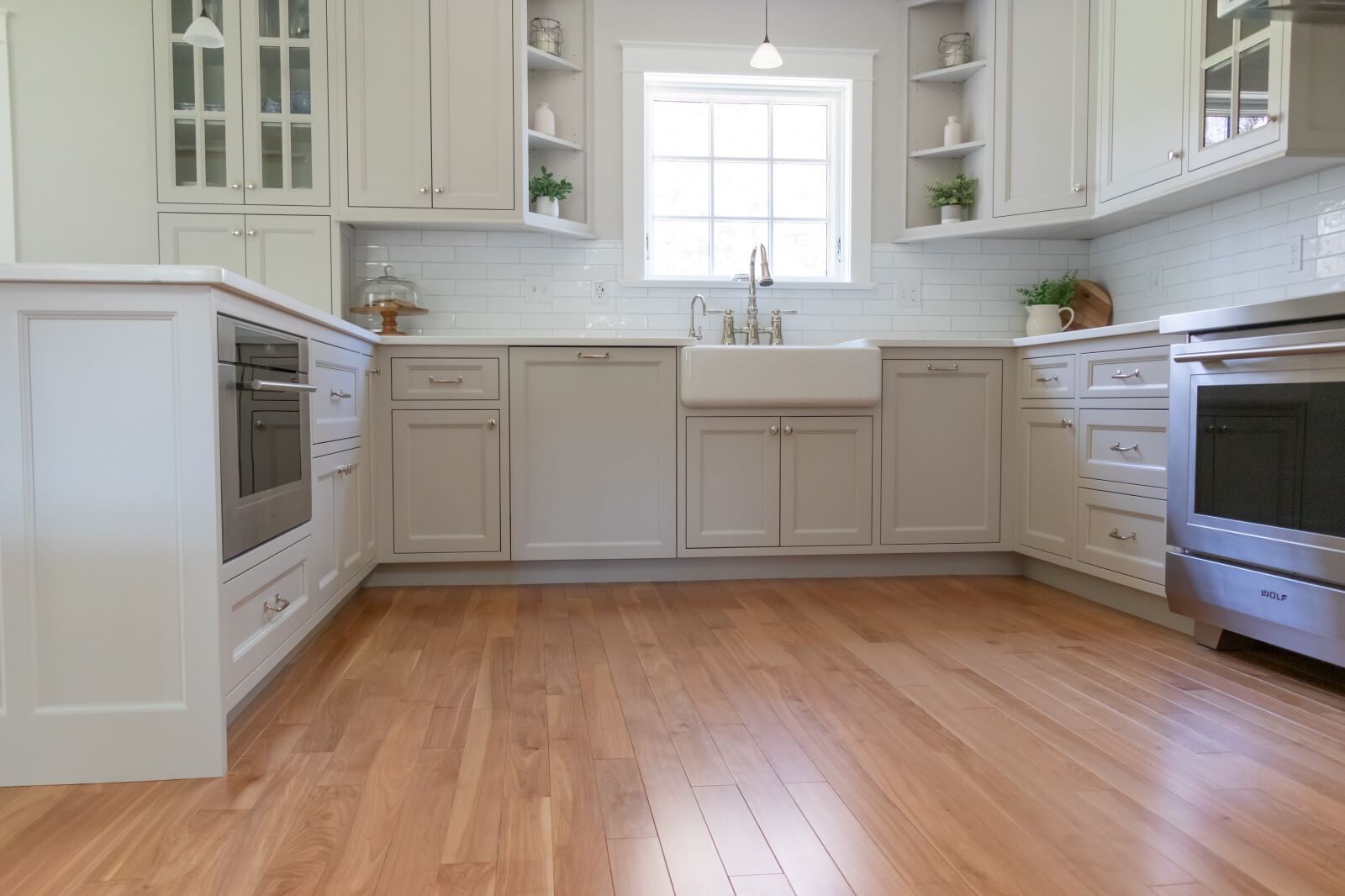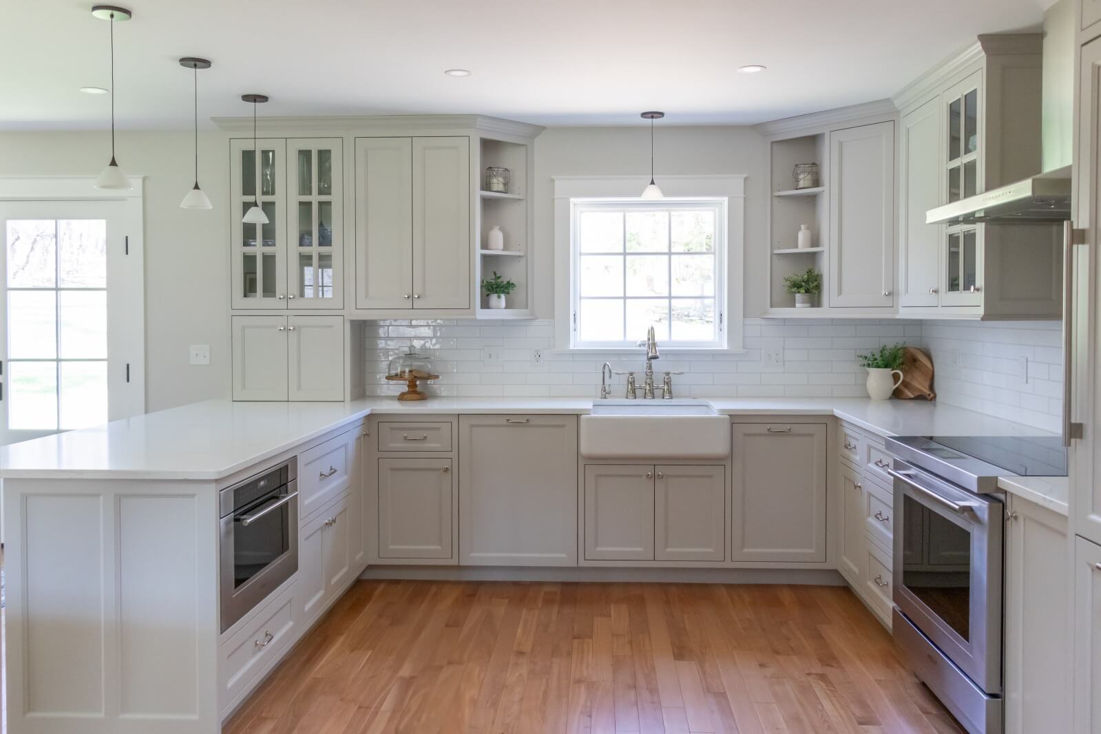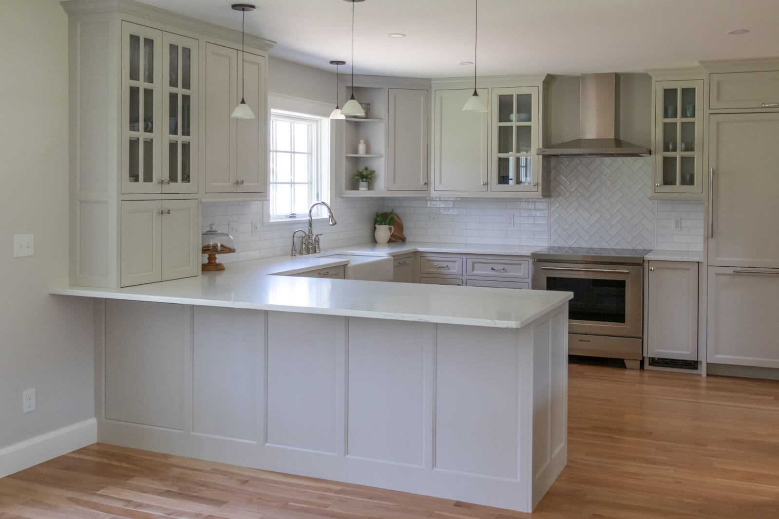 Custom kitchen. Angled cabinets around the windows add a fun touch, I wanted the sink area and window to feel open, but also maximize available wall space. Angle cabinets built as one unit with adjoining cabinets. I like as few seems as possible in a kitchen. Hidden door in left peninsula panel. Added my own beaded profile to the drawers. Crown profile is typical, but made to my own custom size and milled in house.