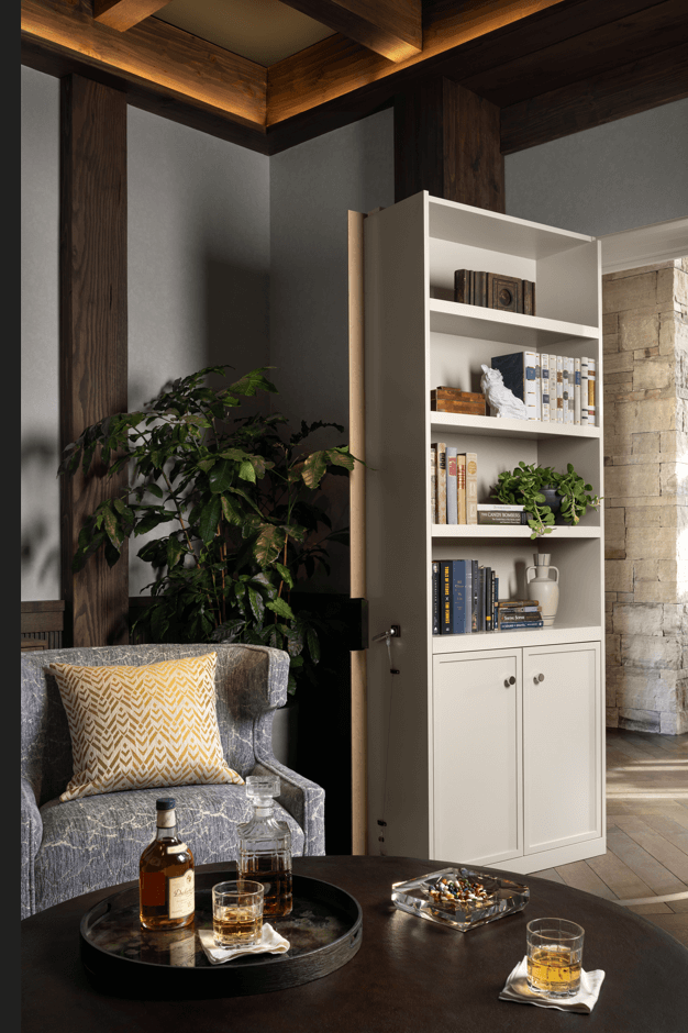 This was one of our most technically challenging—and rewarding—projects in recent years. The client envisioned a library with base and upper cabinets divided into four sections, with one of those sections acting as a hidden door leading to a secret room. Achieving this concept required an expert level of planning and execution. The most complex challenge was engineering the hardware to support the weight of both the base and upper cabinetry while allowing the door section to open smoothly and reliably. At the same time, we had to ensure the hidden door blended seamlessly with the surrounding cabinetry, maintaining a cohesive appearance across the entire wall. The result is a fully functional, elegant bookcase wall with a concealed entry that operates with the pull of a custom-designed book lever. The image of the seating area is the room concealed by the hidden door. The image with the bookcase showcases the door section which opens via a hidden book lever on the bottom shelf.