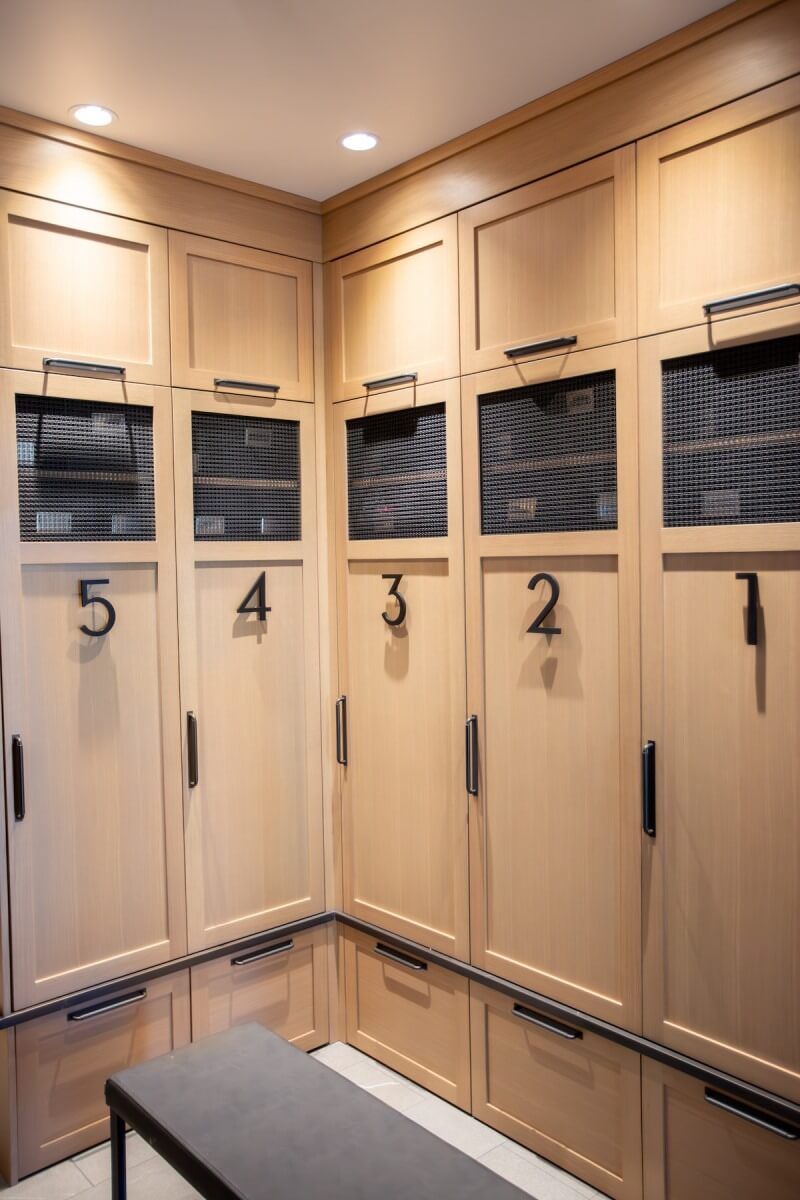 This elevated laundry room design features custom Rift White Oak, including accent floating shelves crafted to match the numbered lockers opposite the washer and dryer. Painted cabinetry offers clean, integrated storage, while a dedicated countertop cabinet enhances organization. Additional features include a pull-out drawer for laundry baskets and a designated hanging area for air-drying garments, combining function with refined style.