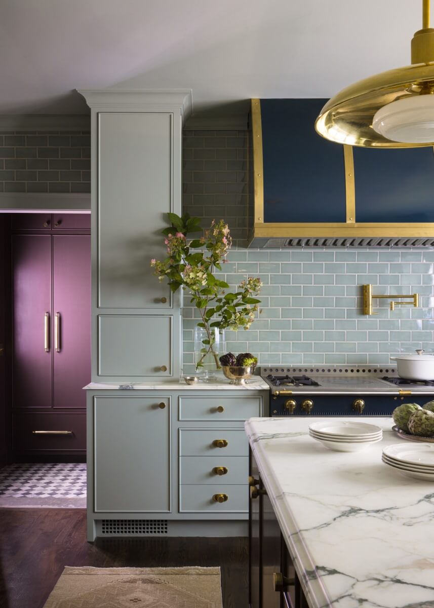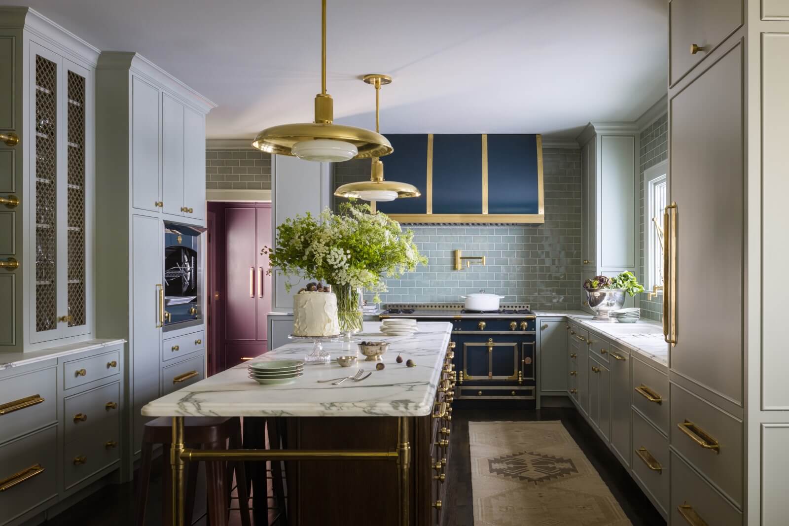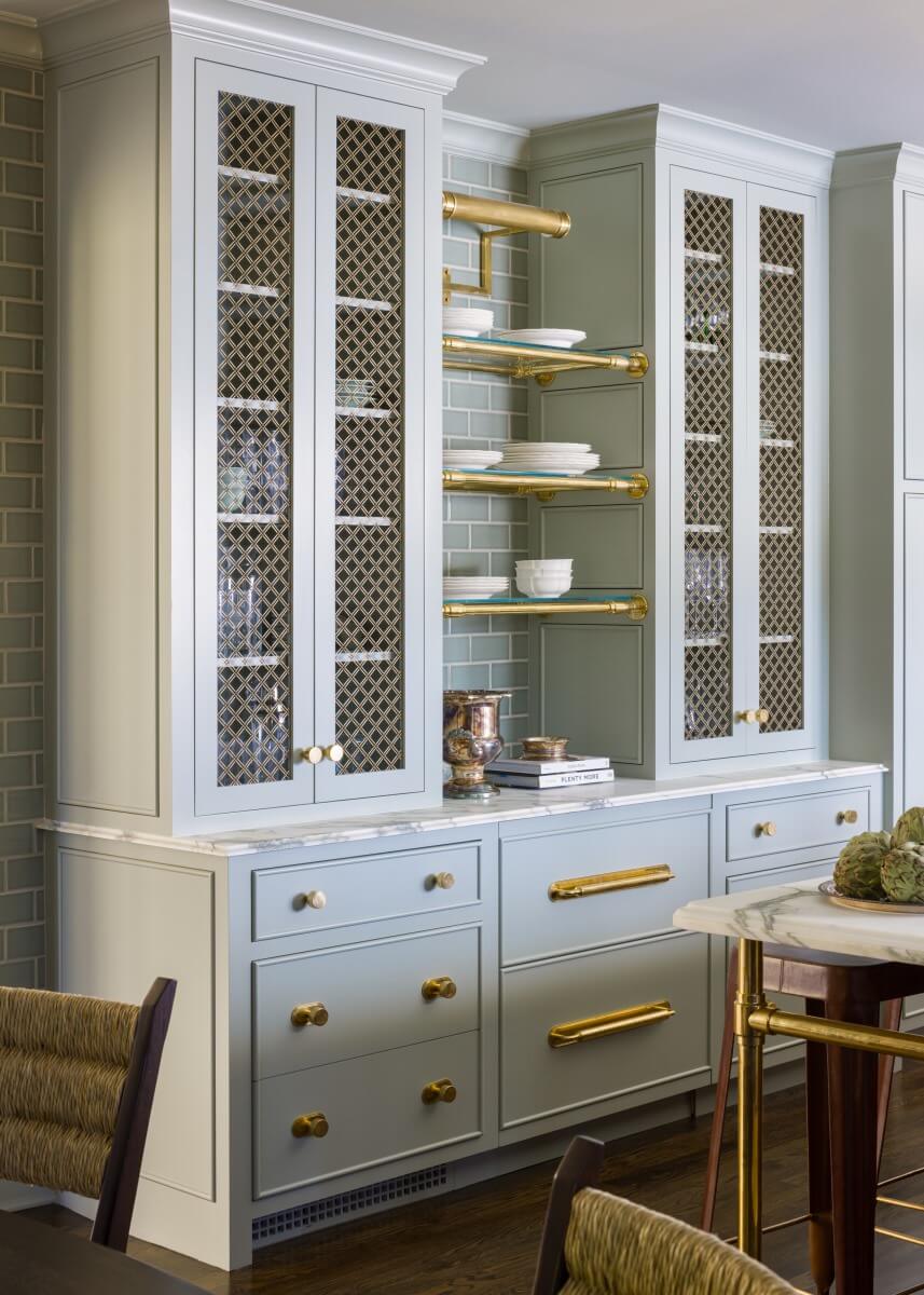 The goal with this kitchen was to bring together a range of design elements in a way that felt cohesive, elevated, and timeless without letting the space become too busy or overwhelming. We started with floor to ceiling inset cabinetry to establish a strong architectural foundation. From there, we introduced slab doors with applied molding to bring in subtle detail, a look that continues through the paneled ends for a consistent, tailored finish. For the hutch, we incorporated brass mesh into the cabinet doors—tying into the hardware and creating a focal point that feels integrated, not separate. To ground the room, we built a darker island that adds contrast while still holding to the same design principles. The addition of brass shelving and a custom brass leg detail on the island helped to pull the entire space together, adding warmth and polish without competing with the cabinetry. The result is a well-balanced kitchen that brings in multiple layers of craftsmanship and material without feeling overdone.