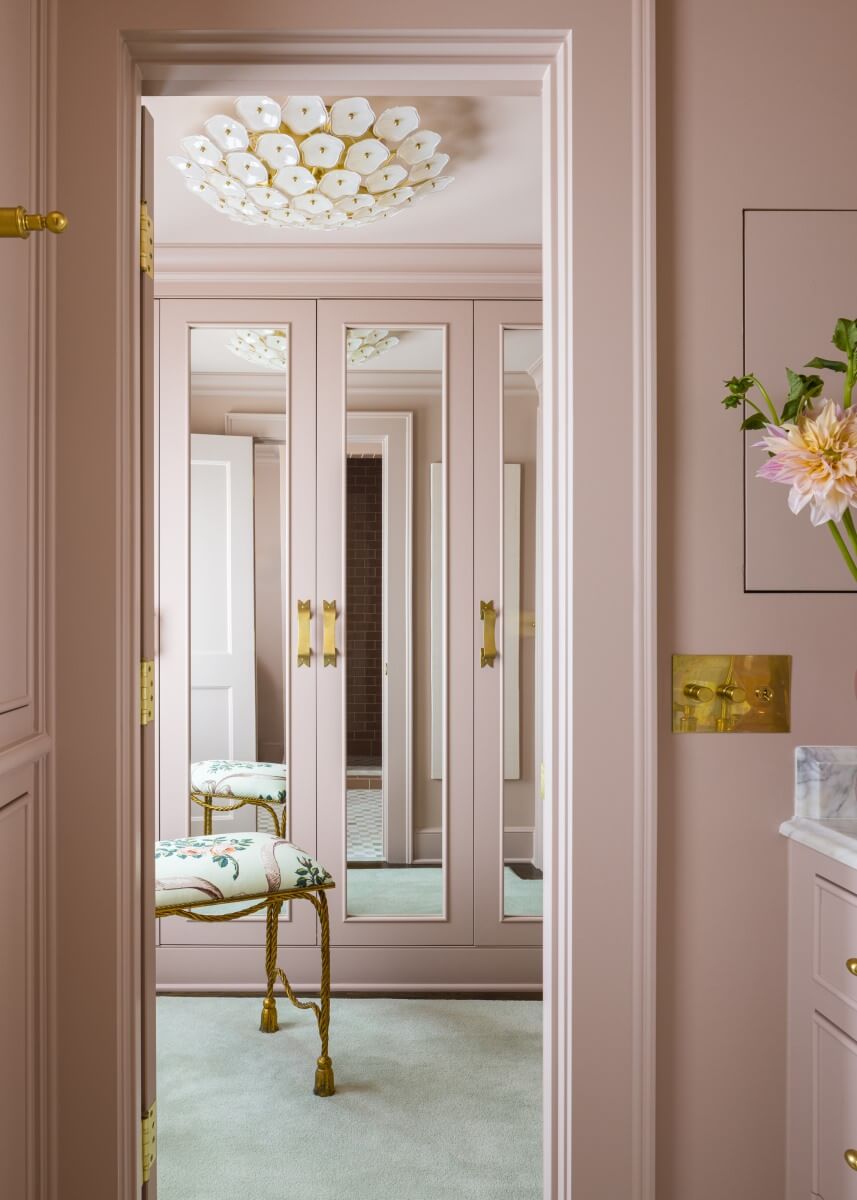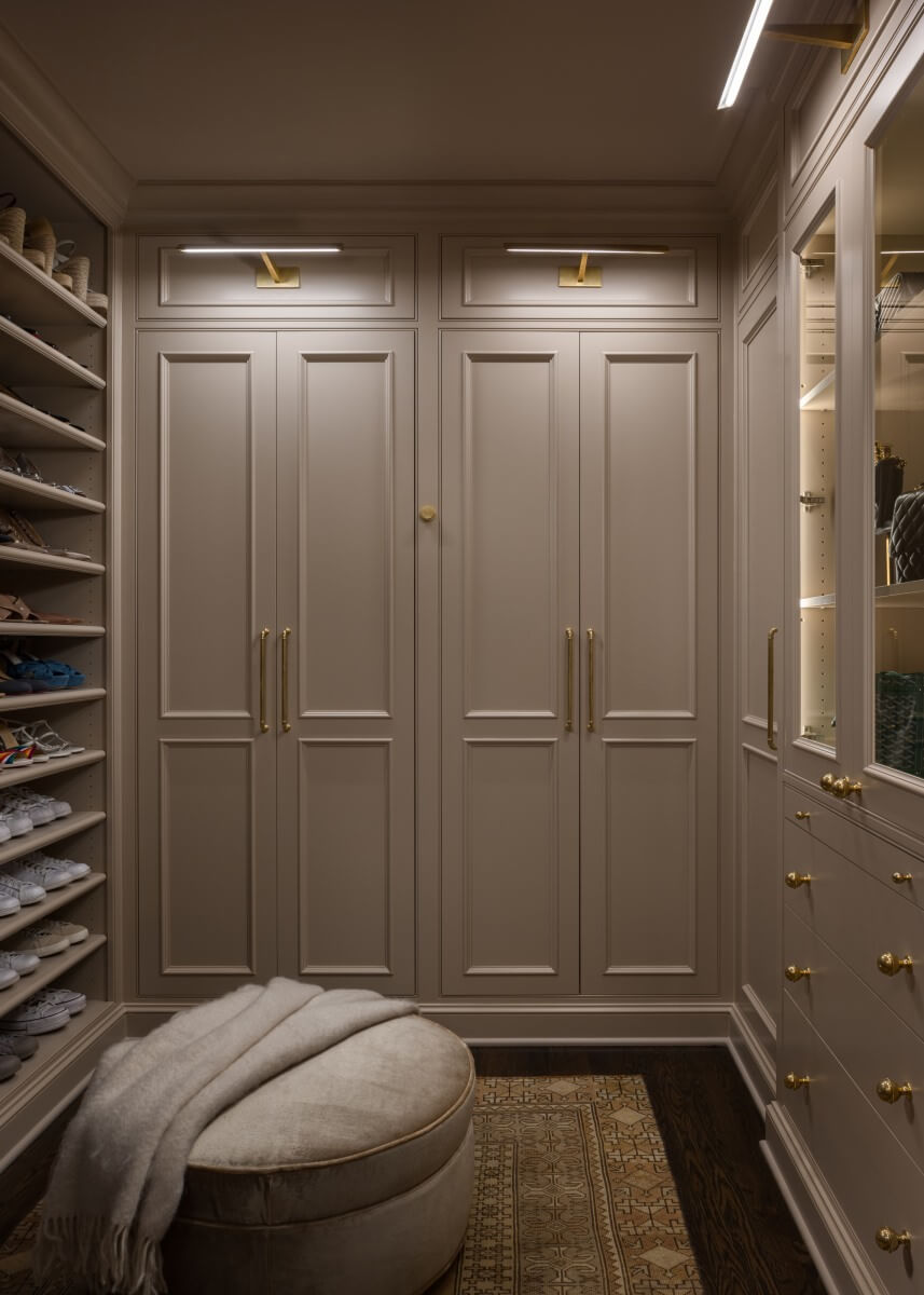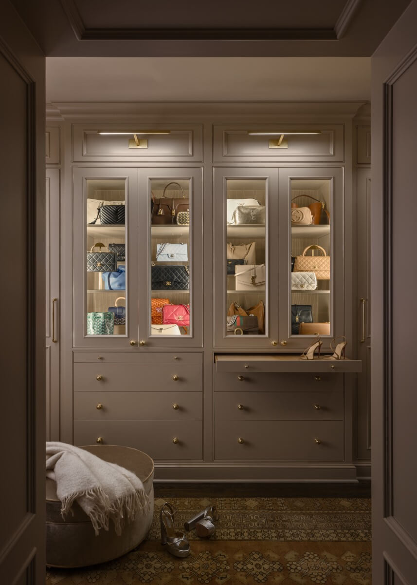 For this project, the client wanted a primary closet that would function as both a highly organized dressing room and a space to display personal items with intention and style. We started with floor-to-ceiling inset beaded cabinetry then added applied molding doors and panels to establish a refined, custom-built look. Tall open shelving was incorporated to allow for generous shoe storage and a dedicated handbag showcase—complete with glass panel doors and integrated lighting—adds elegance and functions as a visual display. To carry the look and feel throughout the space, we added tall, mirrored doors at the entry to the dressing area, enhancing the sense of scale and light while reinforcing the overall design.