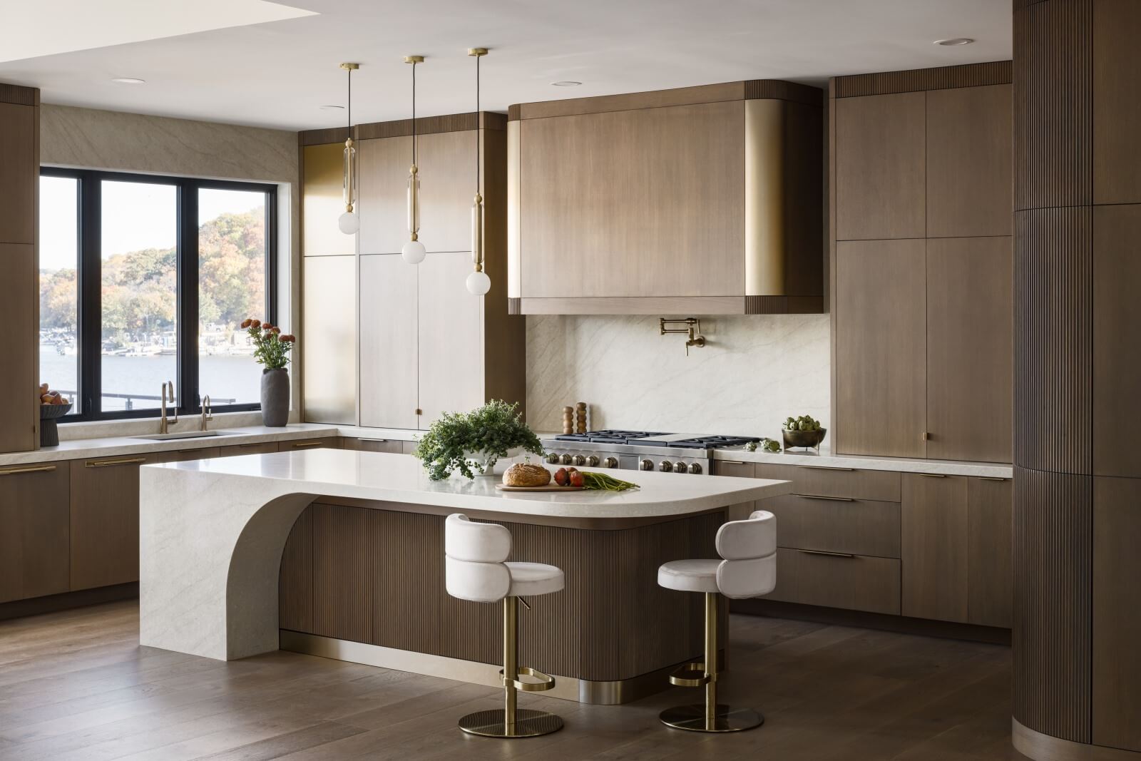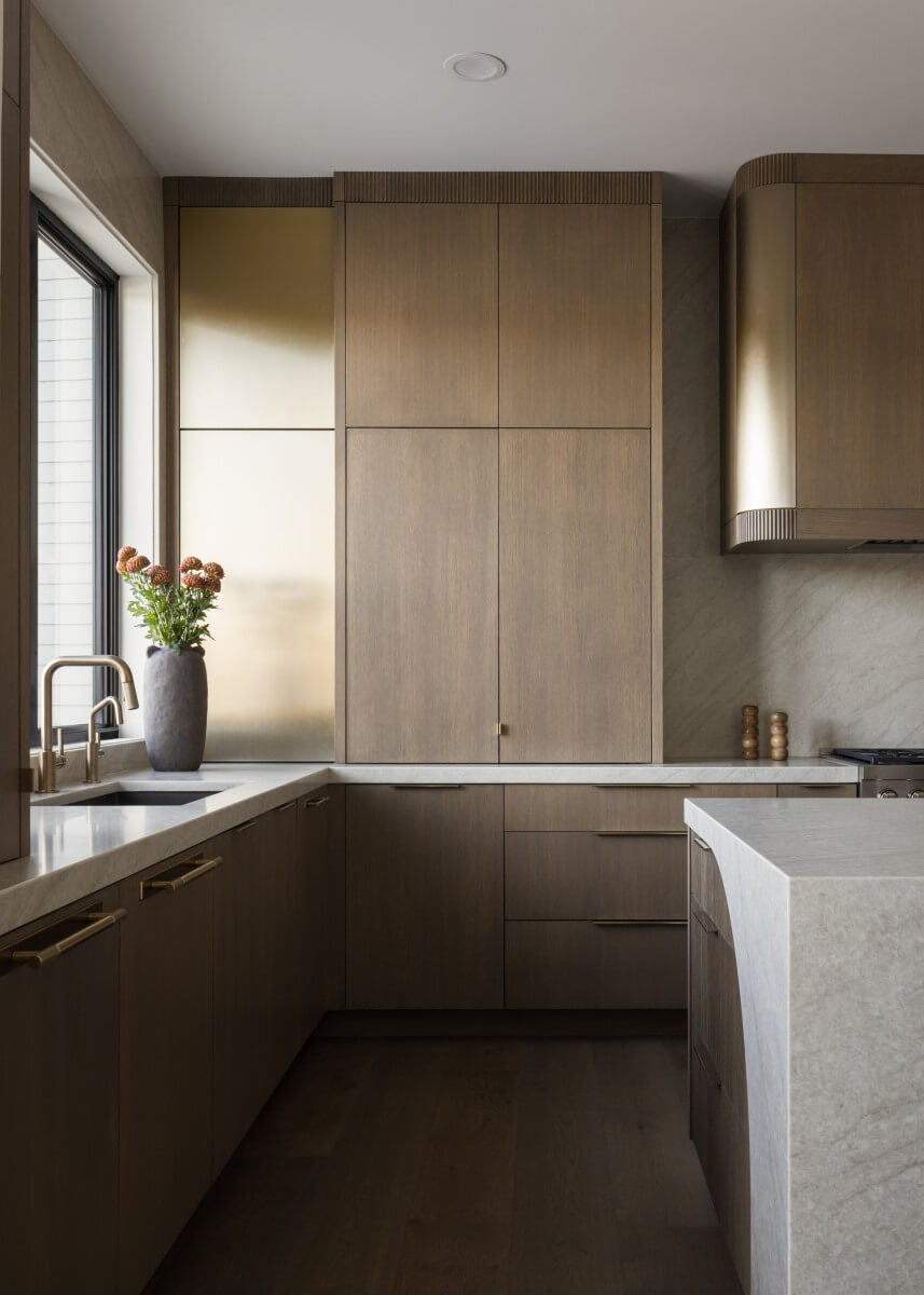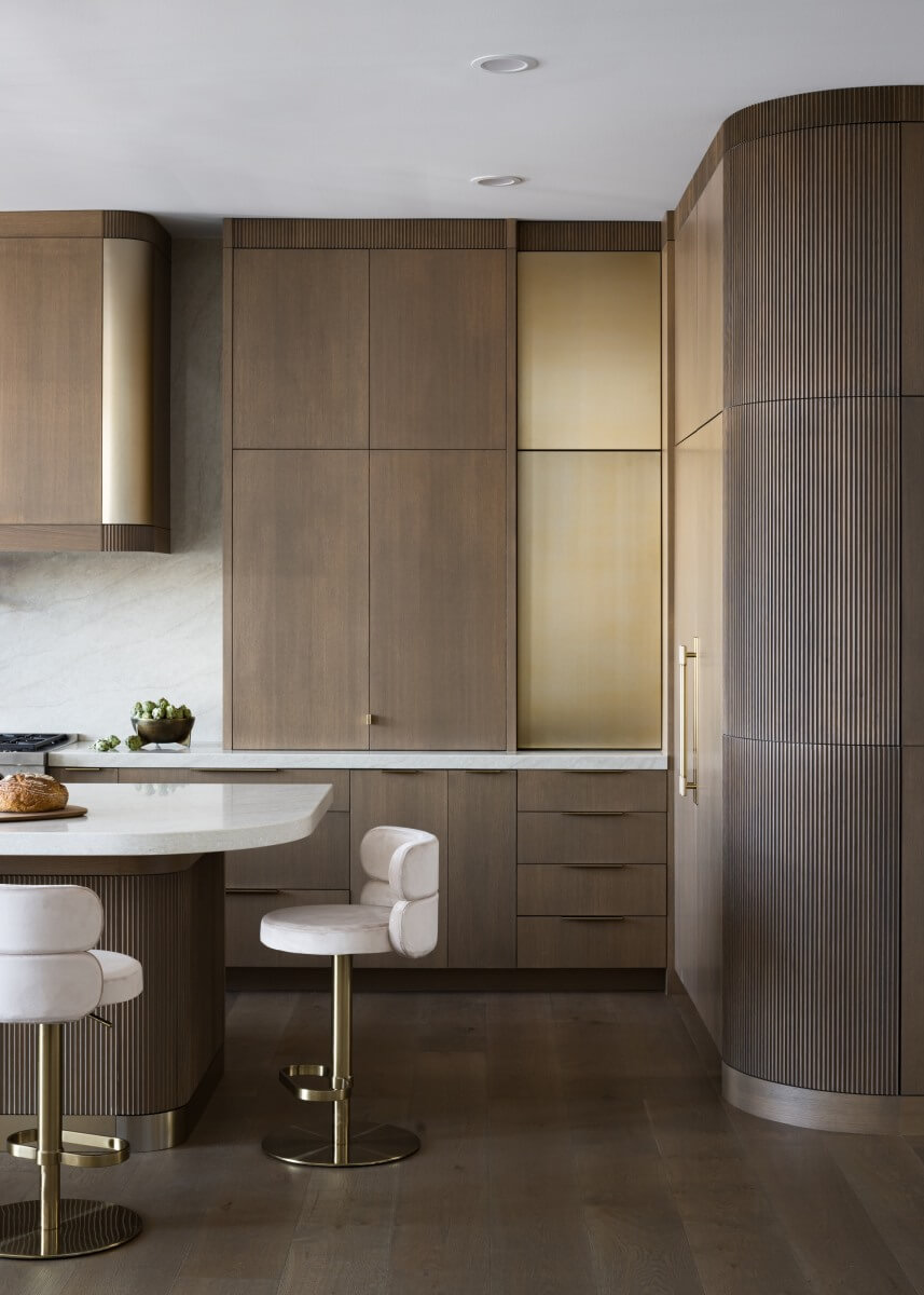 Built from blueprint-matched rift-sawn white oak, this frameless cabinetry brings modern, clean lines to the space while maximizing storage and maintaining a streamlined aesthetic. Slab doors were chosen to provide subtle visual texture without distracting from the simplicity of the overall design. One of the hidden highlights of this kitchen is the fluted, radiused corner cabinet on the right—designed to look like a decorative detail but in reality opens as a fully functional cabinet. Brass accents and fluted crown moldings introduce an artistic layer to the design, while the custom radiused island anchors the room as a sculptural centerpiece for this lakefront home.