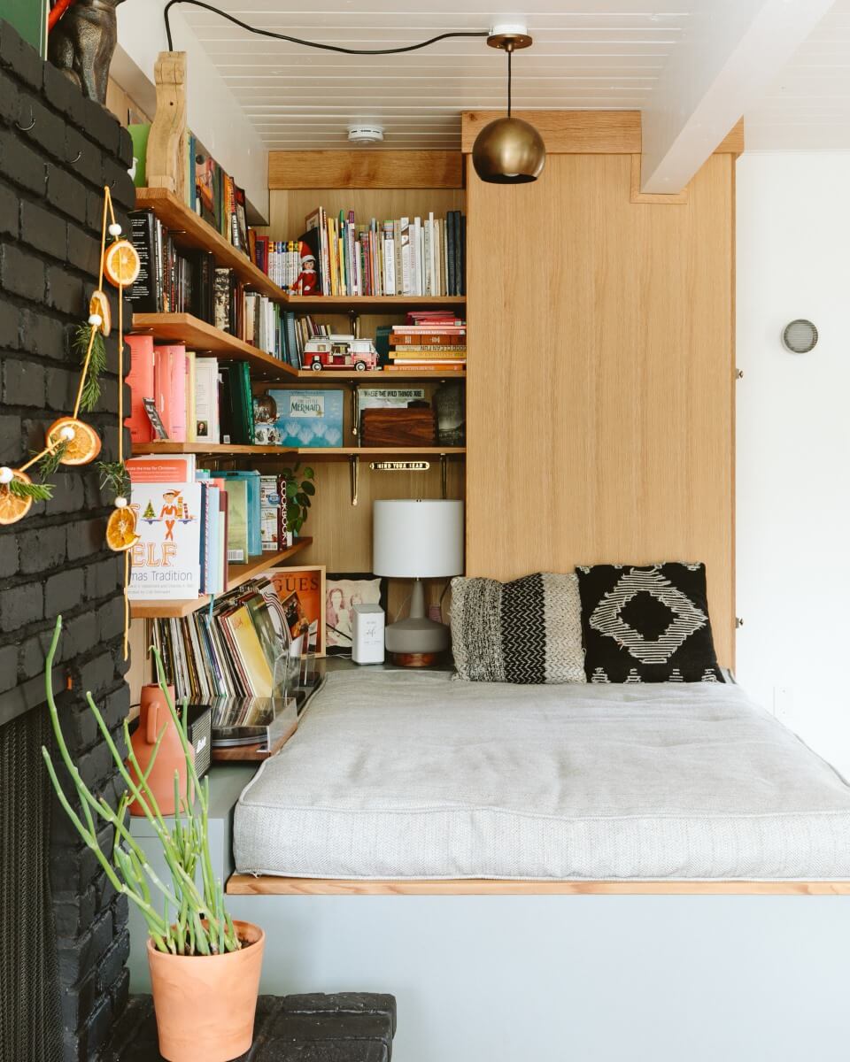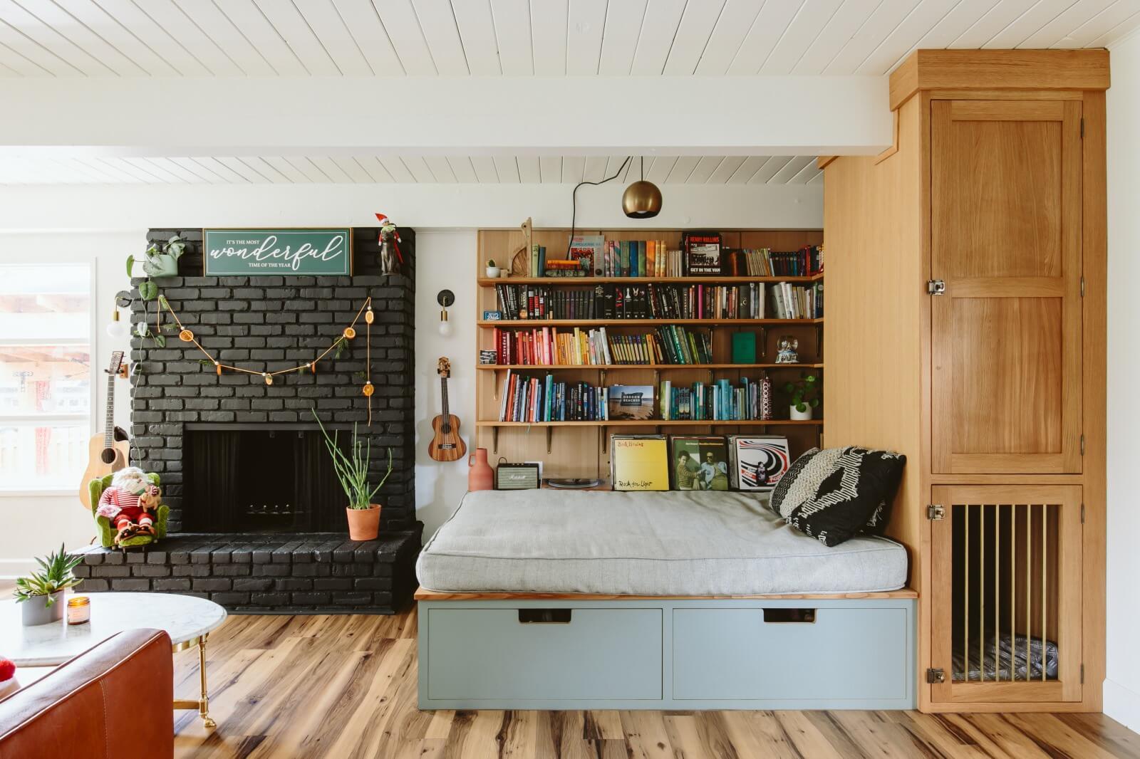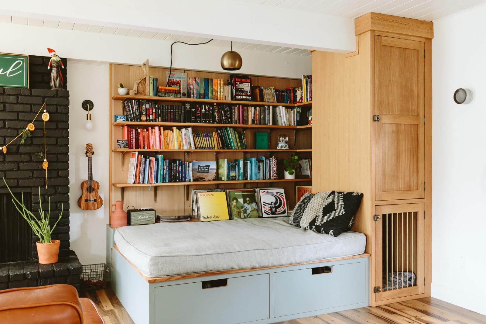 We decided to repurpose an underutilized corner of our living area into a custom library nook. This inviting space features sturdy shelves that hold our family’s collection of books, making it a perfect spot for reading and relaxation. A custom-made futon serves dual purposes, providing a cozy seating area by day and converting into a full-size guest bed for visitors. Above an extra-long dog cage, we incorporated storage for coats, ensuring everything has its place. Additionally, two 5-foot deep drawers were added to neatly house all our shoes, keeping the area organized and functional. The result is a beautifully designed library nook that perfectly balances style and practicality for our busy family.
