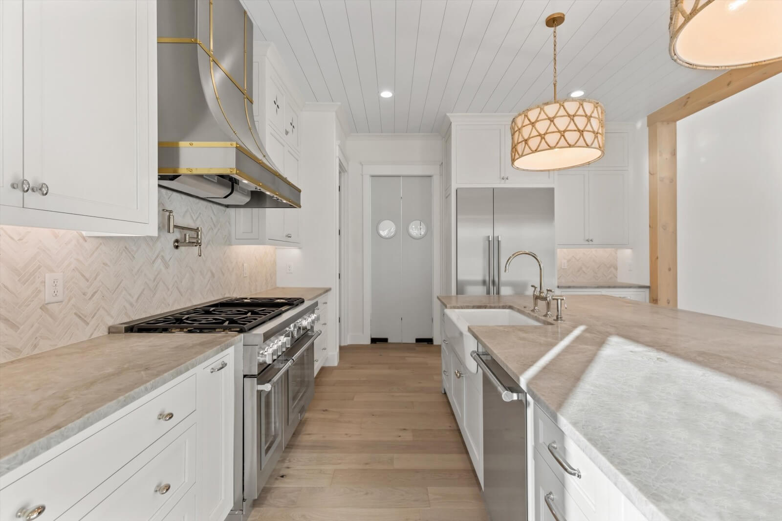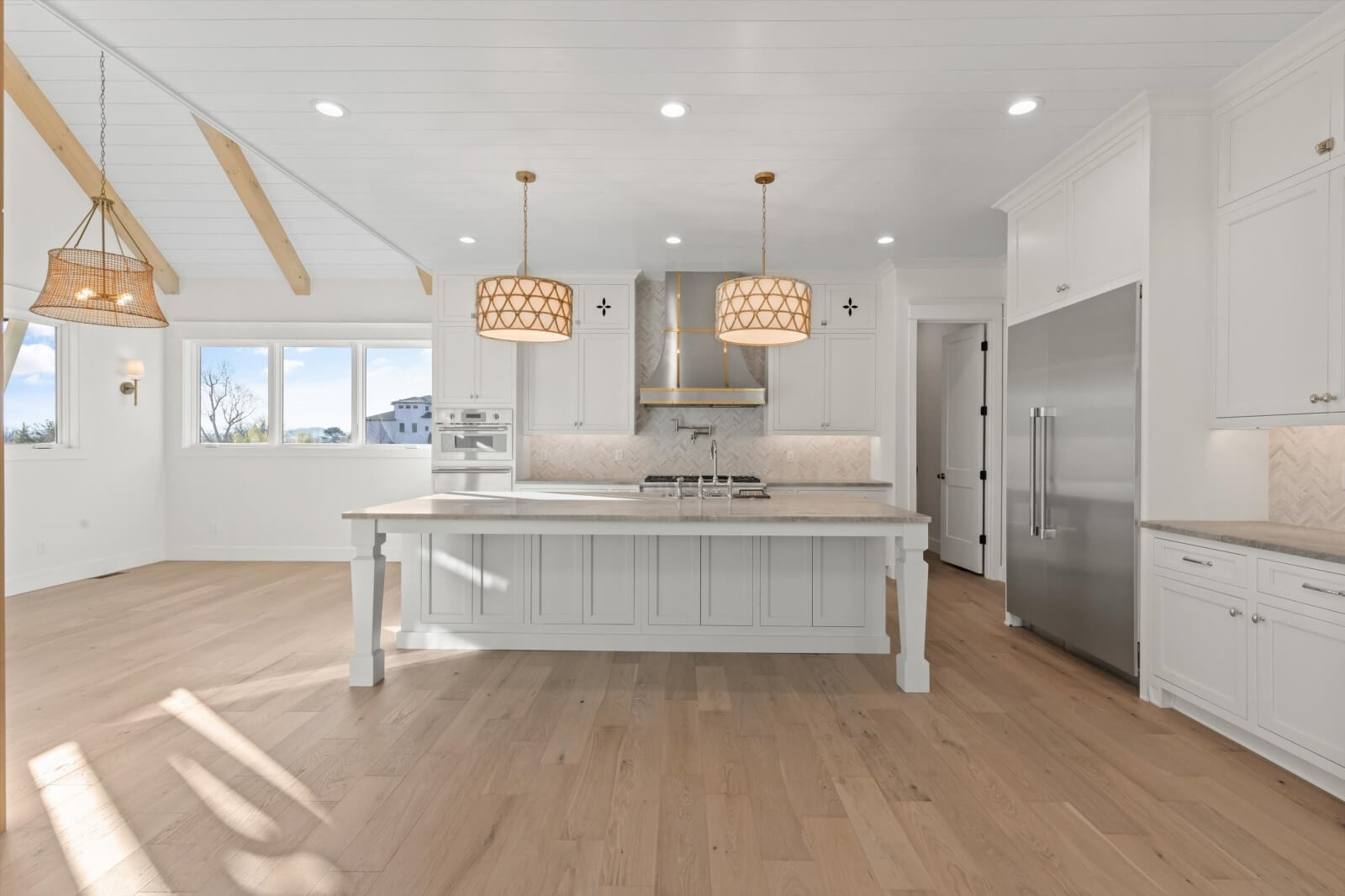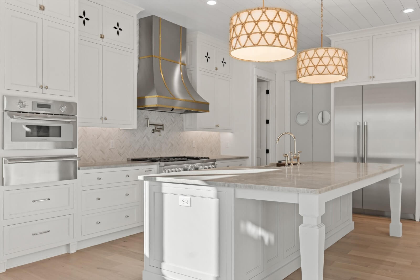 This waterfront project was full of personality and nautical charm. We carried a boat-inspired theme throughout the home, with thoughtful design details that made it truly one-of-a-kind. The upper cabinet doors featured intricate hand-carved motifs, while the kitchen island was finished in a custom color chosen specifically to complement the lakeside setting. Every detail, from craftsmanship to color palette, reflected the homeowner’s love of life on the water.