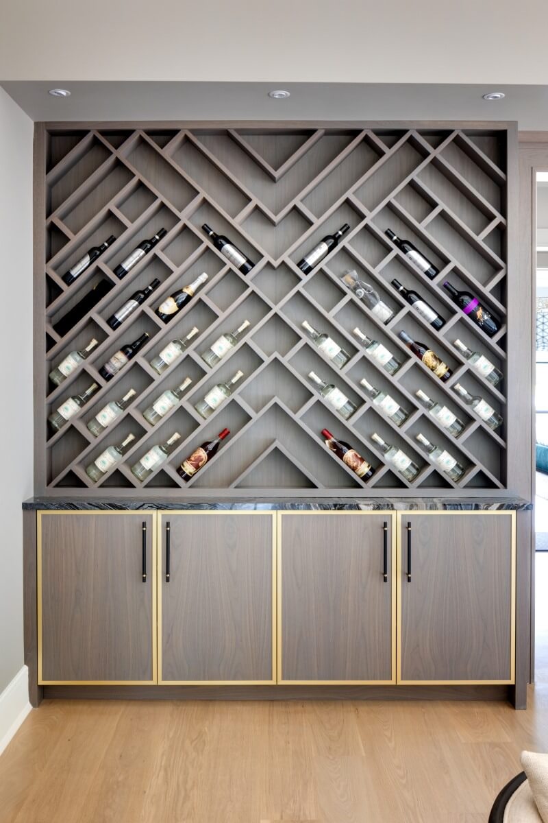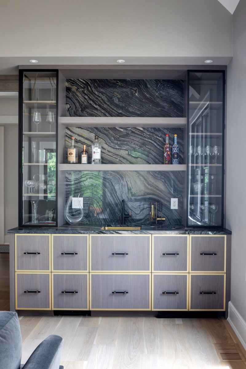 This parlor bar is split into two sections, one on either side of the hallway leading into the room. We have the custom wine storage on the left, with the wet bar on the right. This is a custom gray stain on walnut, with brushed brass frames on the base cabinet fronts. The upper cabinet doors & the left side of the left upper cabinet are black metal frames with glass. Since the left upper cabinet had a glass side, we used a metal rod that is the full height of the cabinet in the front left corner to support our adjustable shelves. There are collars on the rod that the shelf sits on, and then the other 3 corners are supported by standard shelf pins. The wet bar (right side) has a paneled icemaker, paneled 24" fridge drawers, and a pullout trash.