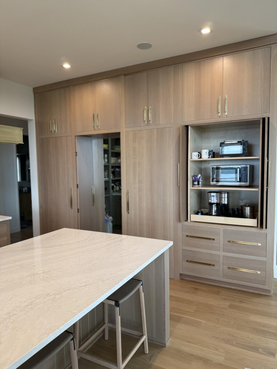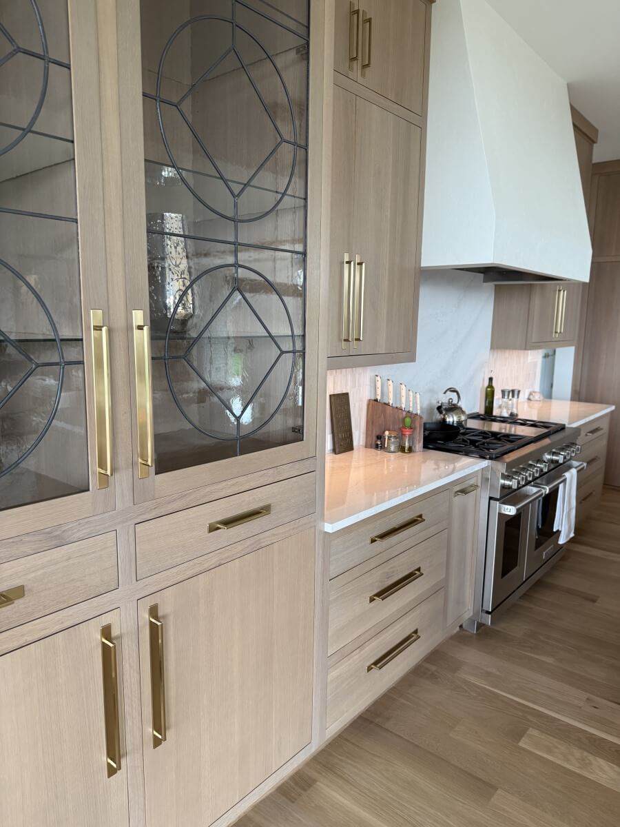 The attached project was a complete labor of love. For the kitchen, we played with the large scale of the ceiling, had a custom mixed stain, incorporated gorgeous custom leaded glass, our normal after-market inserts, a walk-thru pantry, appliance panels, a hidden coffee bar, and many other small details.